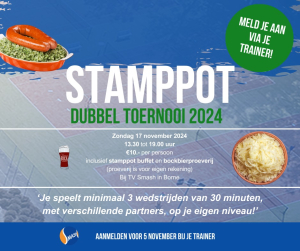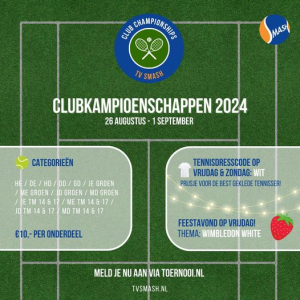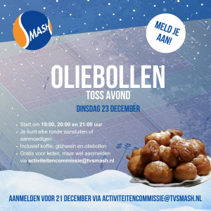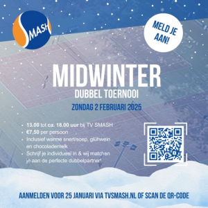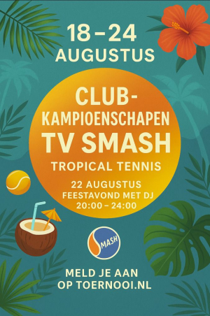 Nieuwjaarstoernooi TV Smash op zondag 18 januari. Begin het nieuwe jaar goed bij tennisvereniging Smash! Op zondag 18 januari luiden we samen het nieuwe jaar in met een feestelijk Nieuwjaarstoernooi, vol tennis, gezelligheid en lekker eten. Vanaf 15:00 uur gaan we de baan op